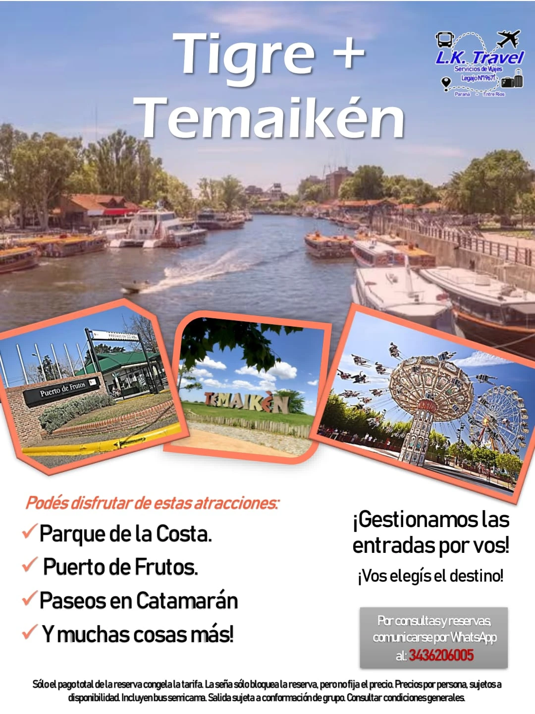 ¿Estás listo para una aventura inolvidable con tu familia? ¡Vamos a explorar el Tigre! Comenzamos con un relajante paseo en día por el río, disfrutando del sol y la brisa fresca. Luego, visitaremos el emblemático Puerto de Frutos, donde podrás encontrar todo tipo de productos frescos y artesanías. Después, nos dirigimos al Parque de la Costa, un lugar ideal para divertirse en familia con atracciones y espectáculos para todos los gustos. Pero el día no termina ahí, porque también visitaremos el increíble Bioparque Temaikén, un oasis de vida silvestre en medio de la ciudad, donde podrás interactuar con animales de todo el mundo y aprender sobre la importancia de la conservación. ¡No te pierdas esta oportunidad de crear recuerdos inolvidables con tus seres queridos! ¡Vamos a hacer de este día uno para recordar!